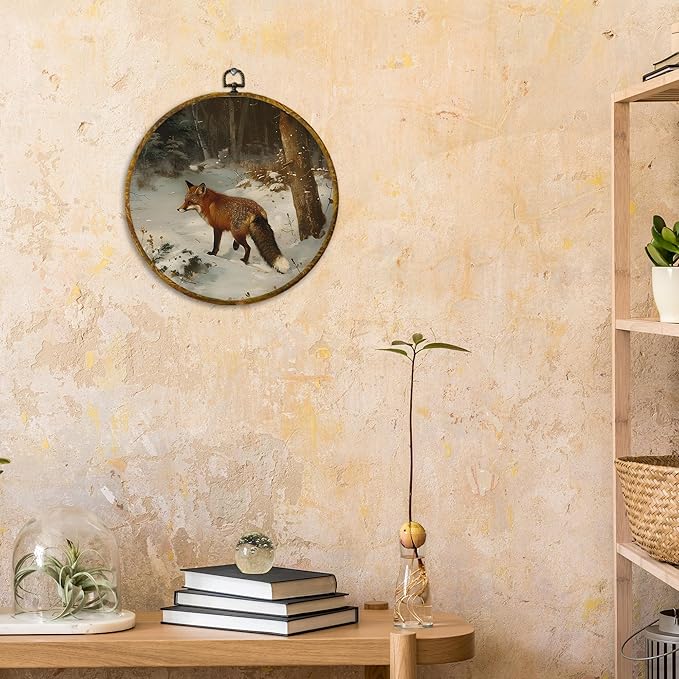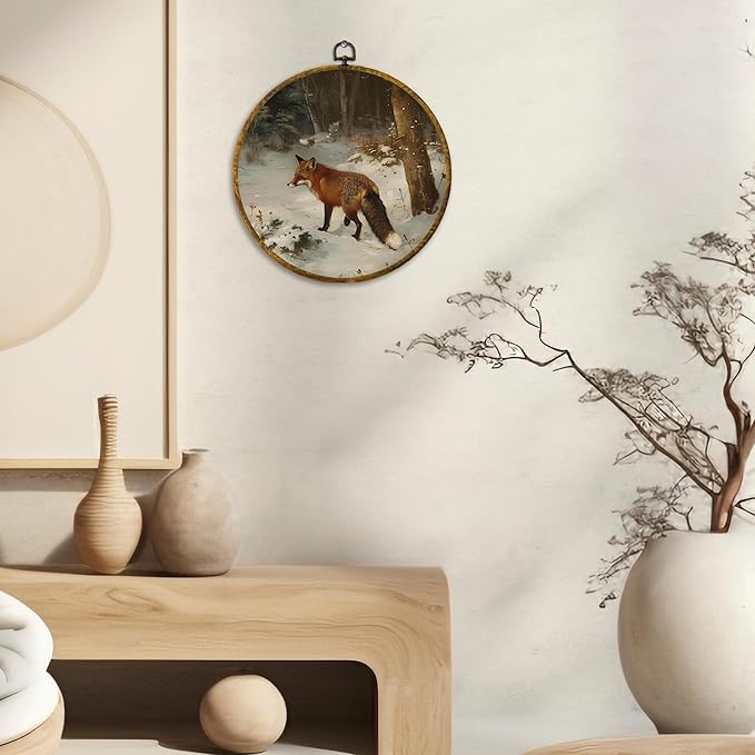 CUANFDDSF Vintage Winter Fox Round Wall Art Decor, Rustic Nature Snowy Forest Fox Wall Hanging Frame Decor, Cozy Winter Farmhouse Wild Animal Canvas Prints Decorations for Home Bedroom, 10x10 Inch
