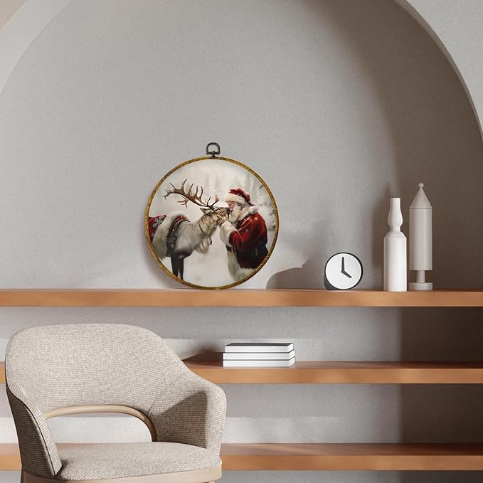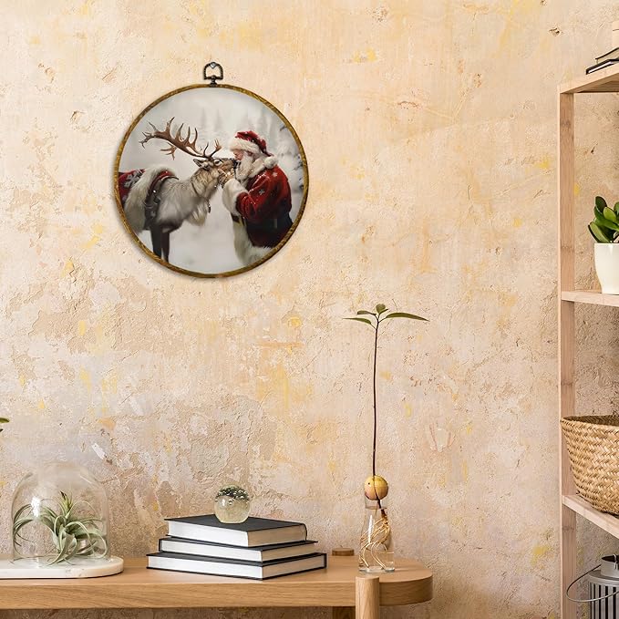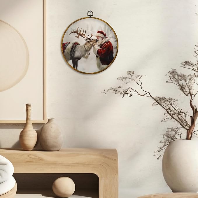 CUANFDDSF Christmas Santa Reindeer Round Wall Art Decor, Rustic Winter Reindeer Santa Claus Holiday Wall Hanging Frame Decor, Winter Christmas Canvas Prints Decorations for Home Bedroom, 10x10 Inch