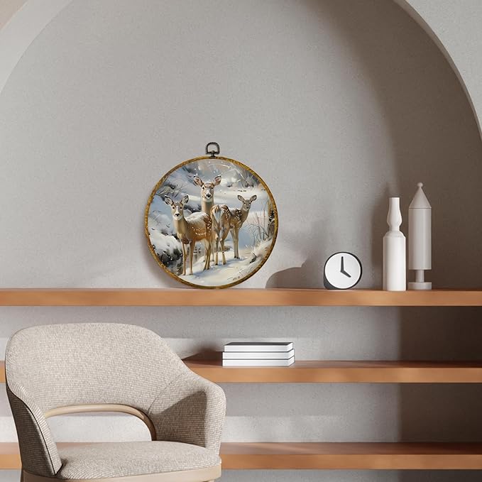 CUANFDDSF Vintage Winter Deer Round Wall Art Decor, Rustic Christmas Winter Deer Wall Hanging Frame Decor, Antique Retro Farmhouse Canvas Prints Decorations for Home Bedroom Living Room, 10x10 Inch