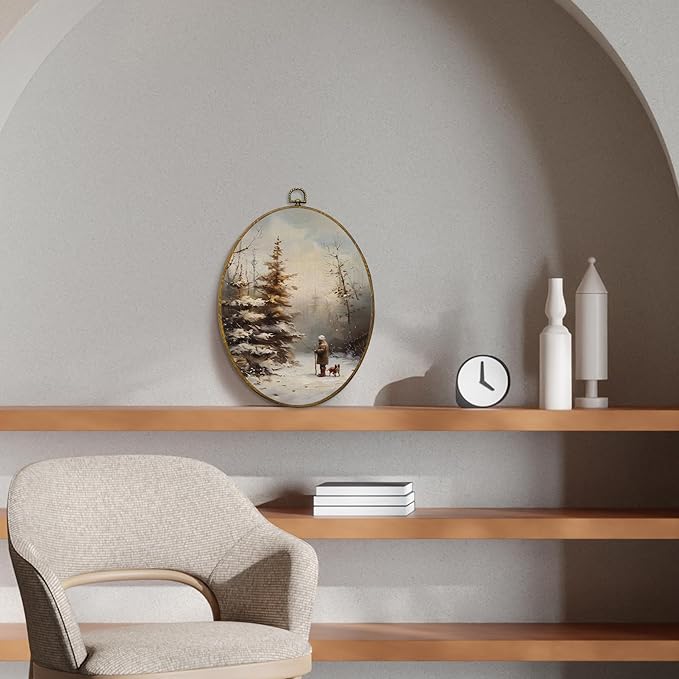 CUANFDDSF Vintage Farmhouse Winter Oval Wall Art Decor, Rustic Christmas Pine Tree Landscape Wall Hanging Decor, Retro Country Winter Framed Canvas Prints for Home Bedroom Living Room, 8.6x11.4 Inch