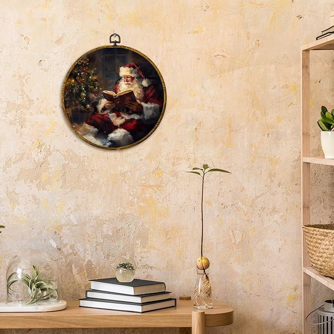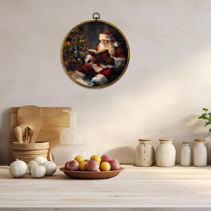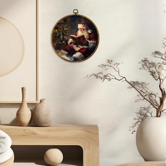 CUANFDDSF Vintage Christmas Santa Reading Round Wall Art Decor, Cozy Xmas Tree Santa Claus Holiday Wall Hanging Frame Decor, Winter Christmas Canvas Prints Decorations for Home Bedroom, 10x10 Inch