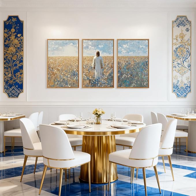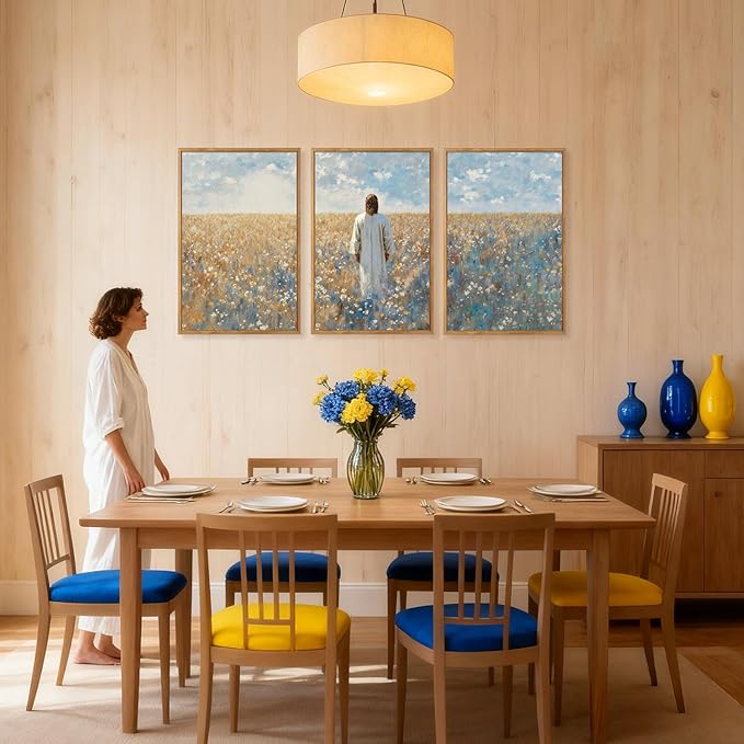 - JESUS DESIGN: This three-panel wall art set features a serene depiction of Jesus walking through a field of flowers under a sky filled with clouds. The artwork skillfully integrates elements of nature and spirituality to create a peaceful and inspiring aesthetic.