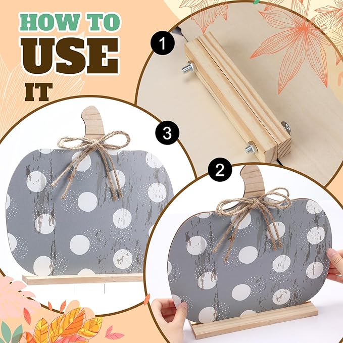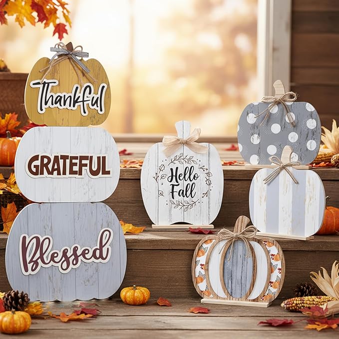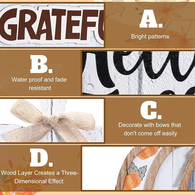 - Rich Packaging: you will receive 5 pcs of well crafted pumpkin themed porch signs and 4 base; The pumpkin elements and the text on the wooden sign perfectly convey gratitude and blessings for the fullness of the fall harvest; The pastoral color will add a lot of fall feeling to your home so that it will fit perfectly into your decor