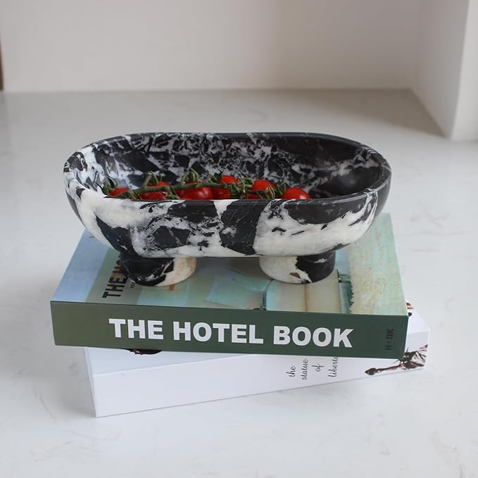 Natural Oval Calacatta Black Marble Fruit Bowl for Kitchen Counter 10", Large Decorative Bowl Two-Legs for Home Decor, Fruits Holder For Dining Table - Kitchen Organization