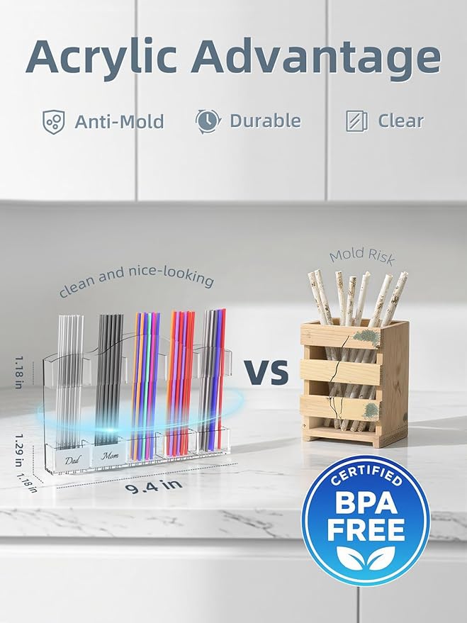 - 【Space for What Matters Most】 Mount inside cabinet doors (hidden, but handy!) or on countertops—either way, it frees up drawer space for things you care about. Perfect for kitchens, RVs, cafes—anywhere clutter crushes joy. This acrylic straw holder doesn’t just organize straws; it organizes a happier daily routine.