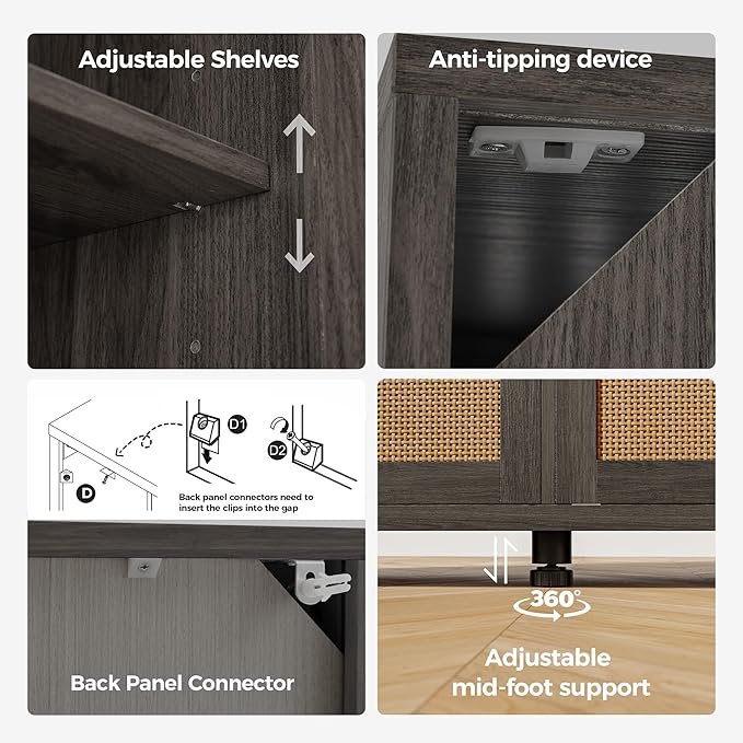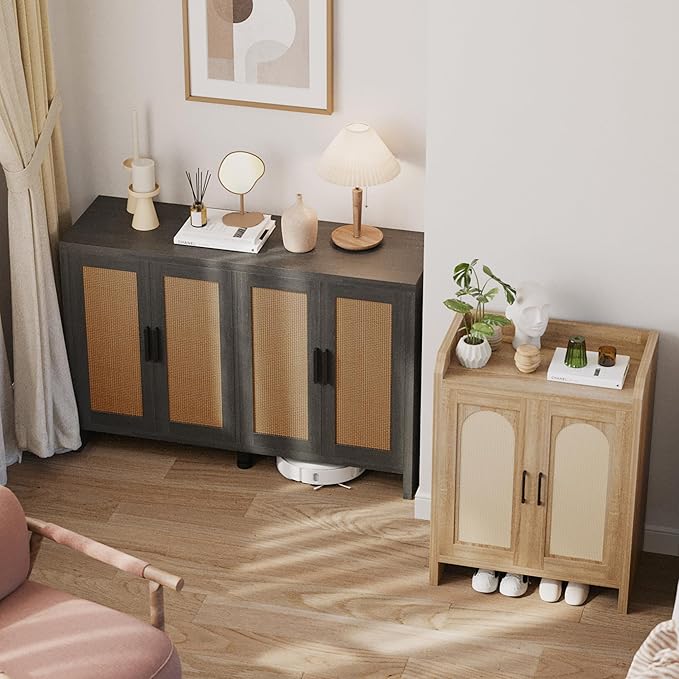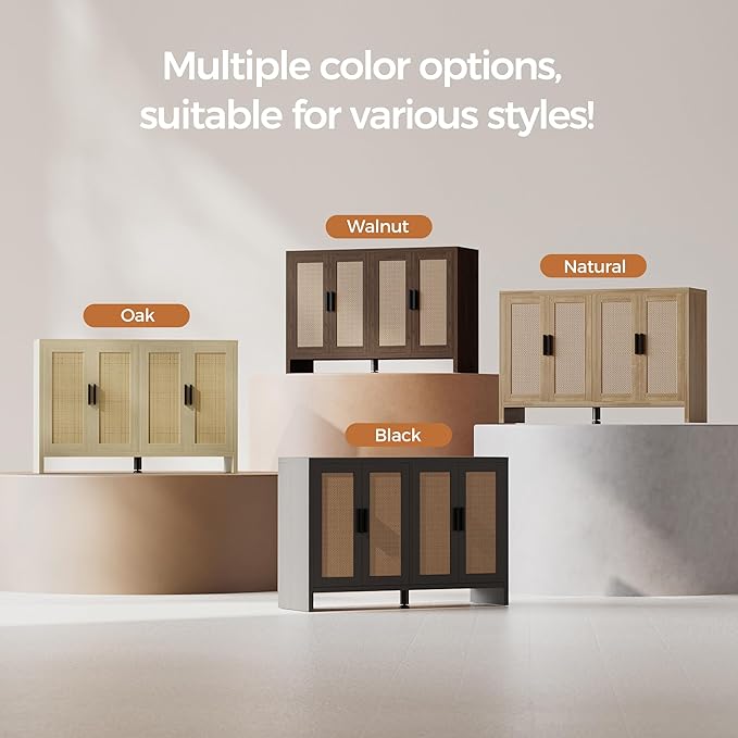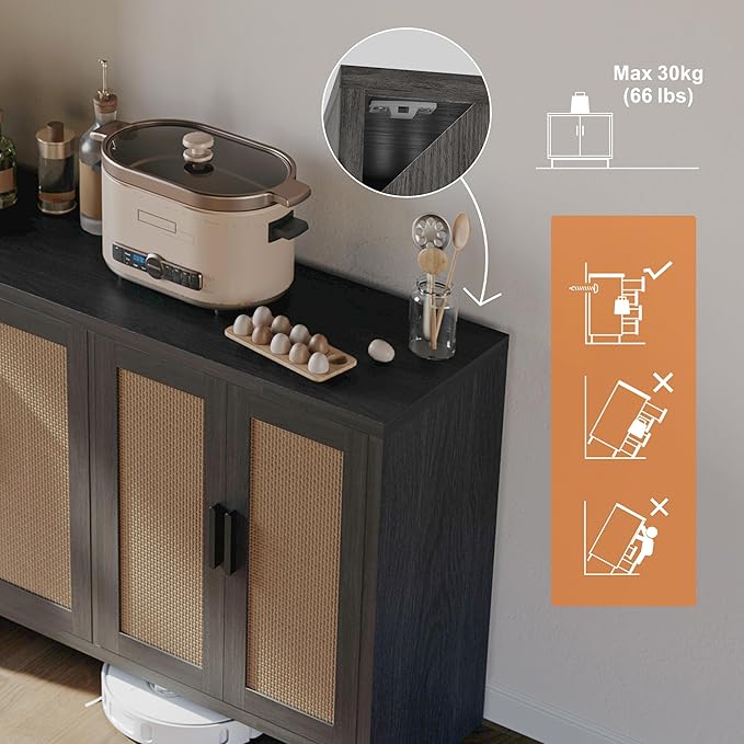 - 【Bohemian design】 This credenza storage cabinet is equipped with 4 design rattan wood doors, kitchen sideboard with black metal handles, adding a unique sense of fashion and charm to the product. The spacious top countertop can be used as a cooking table or to store tableware, etc., keeping the kitchen clean and tidy.