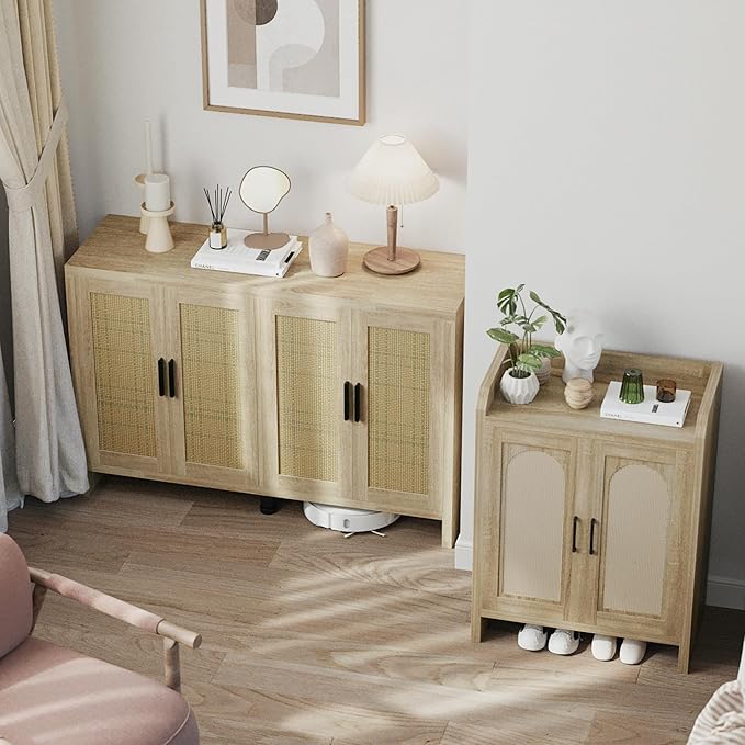 Rattan Buffet Cabinet with Storage, Sideboard with Doors, TV Stand, Farmhouse Side Board Coffee Bar, Modern Wood Storage Cabinets for Livingroom, Kitchen and Dining Room (Oak)