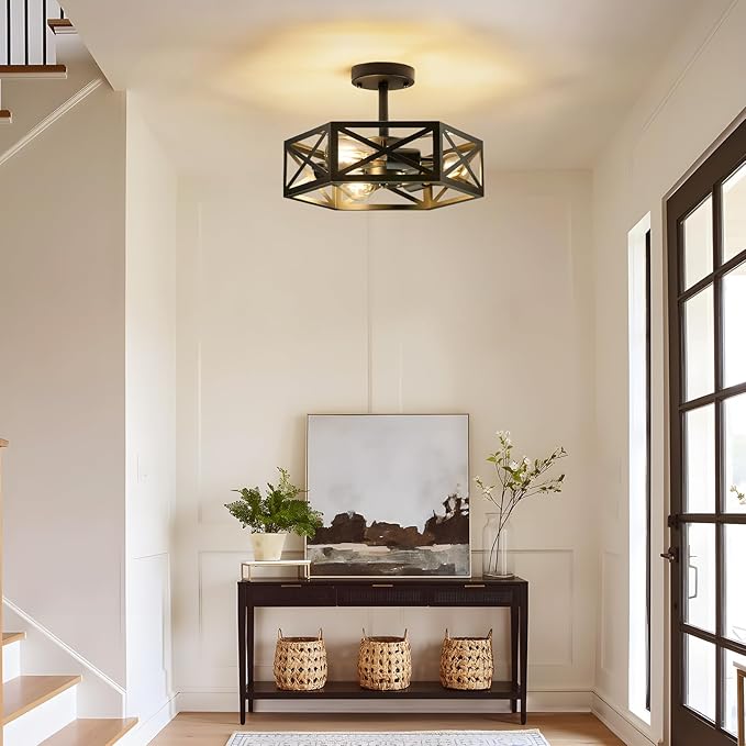 Modern Semi Flush Mount Ceiling Light,3-Light Hexagon Flush Mount Ceiling Lights for Dining Room Light Fixture,Farmhouse Black Metal Kitchen Island Lighting Fixtures for Hallway,Bathroom
