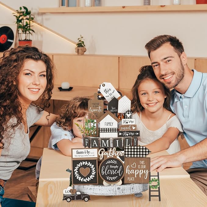 Yaomiao 21 Pcs Farmhouse Tiered Tray Decor Set Rustic Farmhouse Wood Decor Sign Vintage Rustic Family Gather Blessed Tiered Tray This is Our Happy Place Sign for Home Kitchen Table Shelf (Classic)
