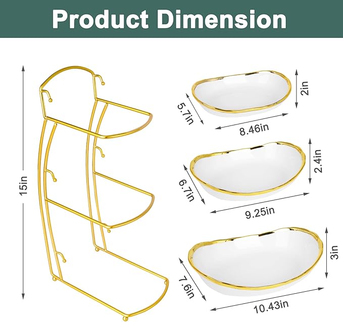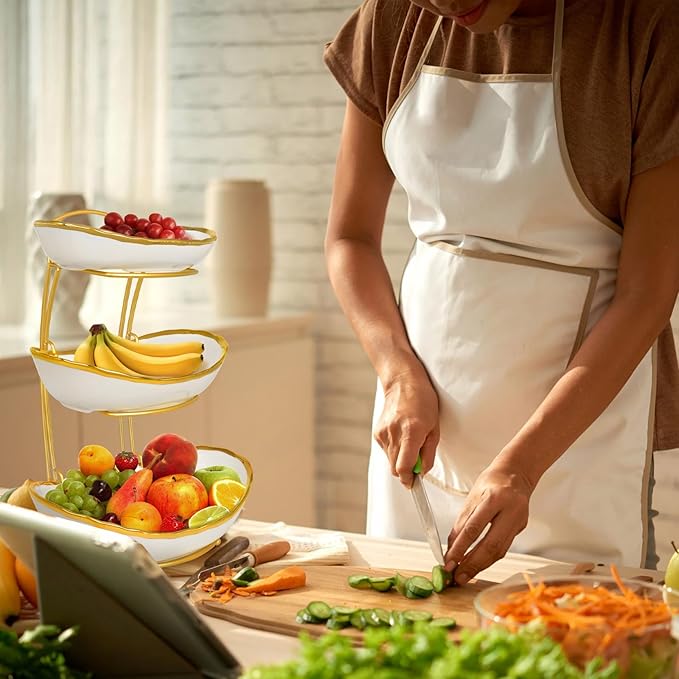 3 Tier Fruit Bowl for Kitchen Counter, Ceramic Serving Bowls with Gold Metal Stand, Tiered Fruit Basket Display Rack for Fruits Vegetable Snack Nuts Cake Dessert Storage