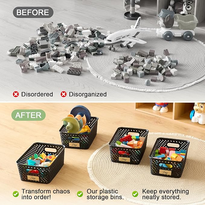 Small Plastic Twill Woven Storage Baskets, Stackable Organizing Containers with Labels for Pantry Office Kitchen, 6-Pack, Black