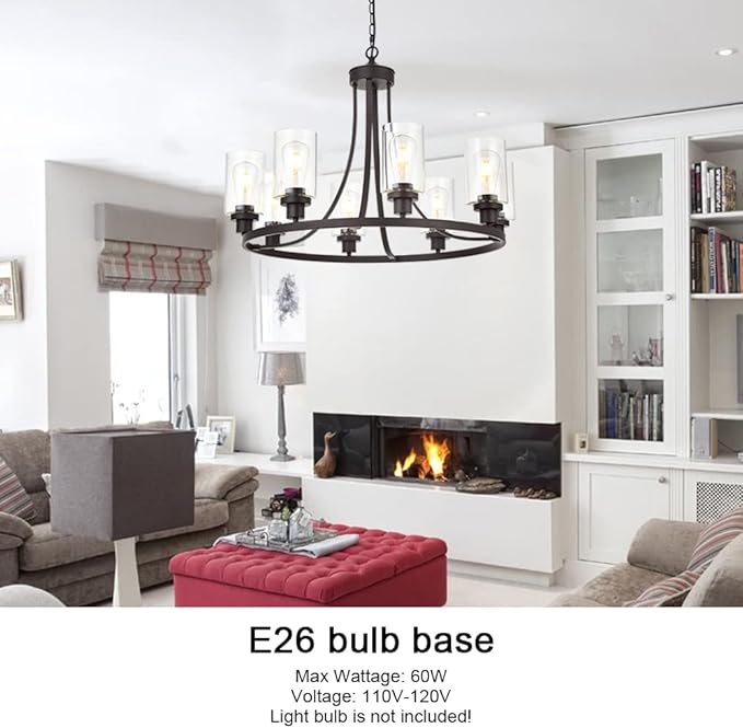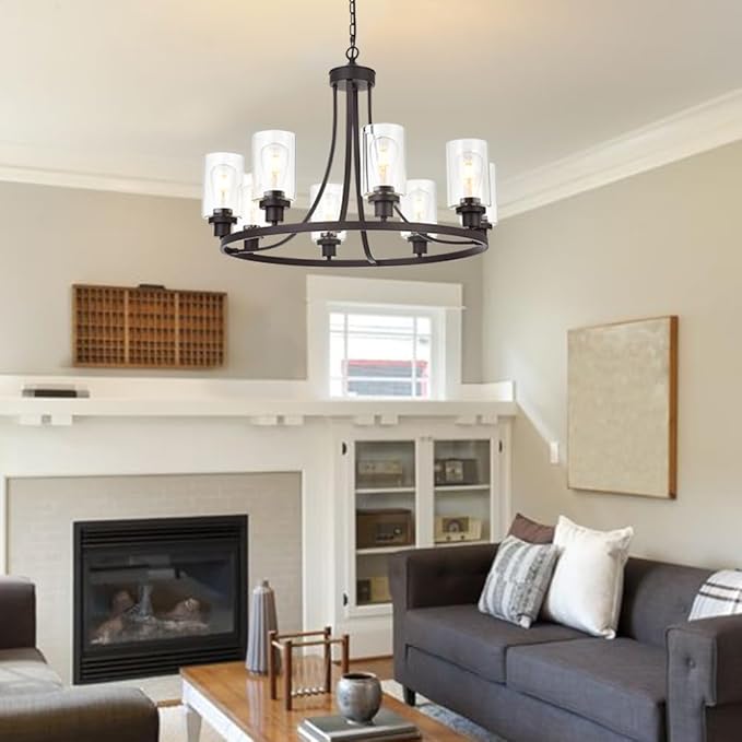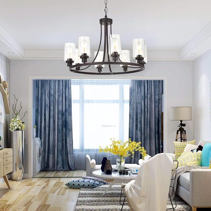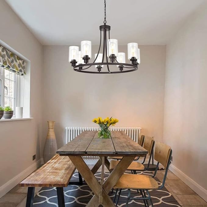 - Unique Design: This round chandelier offers a farmhouse appearance with clean lines and a metallic oil rubbed bronze finish. 8 lights sit atop a wagon wheel-inspired frame, each highlighted by a cylindrical clear glass shade to create an even gleam