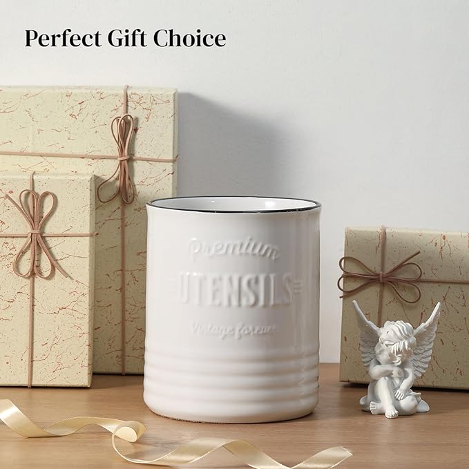 - Vintage Home Decor: This elegant and multi-purposed optimal utensil holder for kitchen counter, also serving as a utensil caddy or vase, is the best for those seeking a trendy, rustic farmhouse look. Add a little country charm to your home decor! If you’re looking for a memorable gift for your love, look no further, this will be a great gift she will use