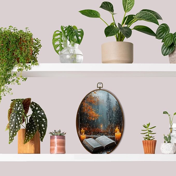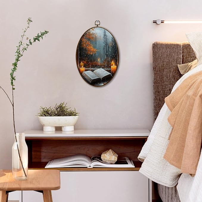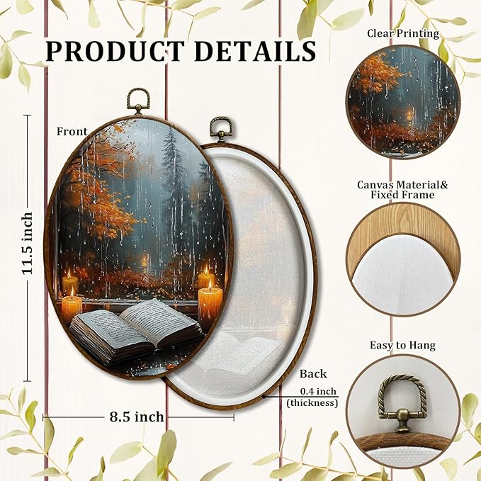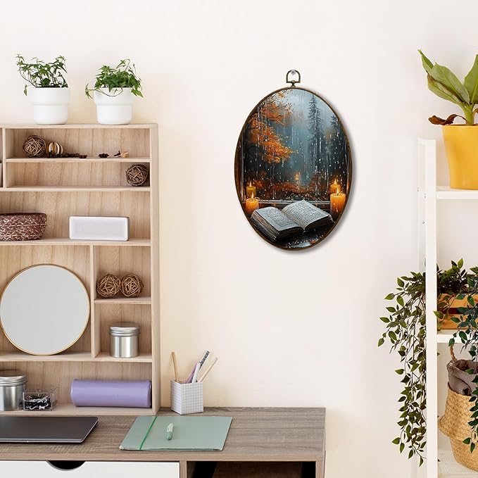 JQF Dark Academia Fall Rainy Oval Wall Art, Cottagecore Rainy Fall Candle Oval Canvas Wall Art, Dark Academia Bookish Framed Prints Hanging Decor for Home Bedroom Reading Room Library, 8.5x11.5 Inch