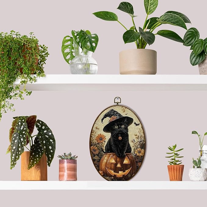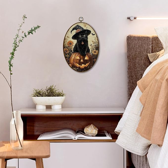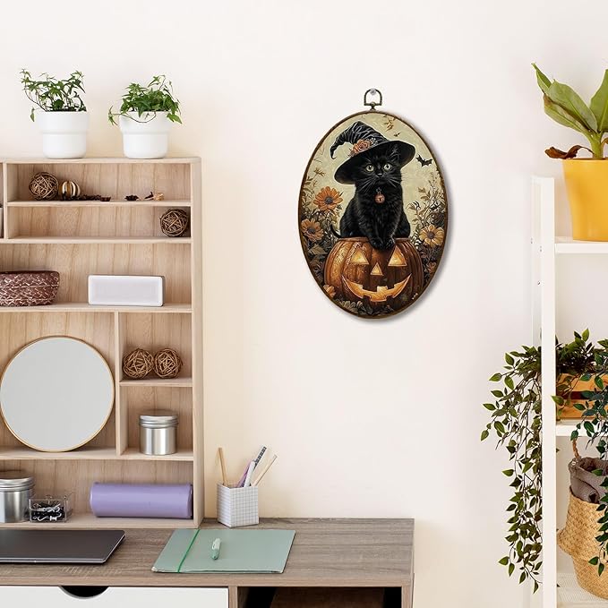 JQF Vintage Halloween Witchy Black Cat Oval Wall Art, Dark Academia Gothic Witch Pumpkin Oval Canvas Wall Art, Halloween Fall Framed Prints Hanging Decor for Home Bedroom Living Room, 8.5x11.5 Inch