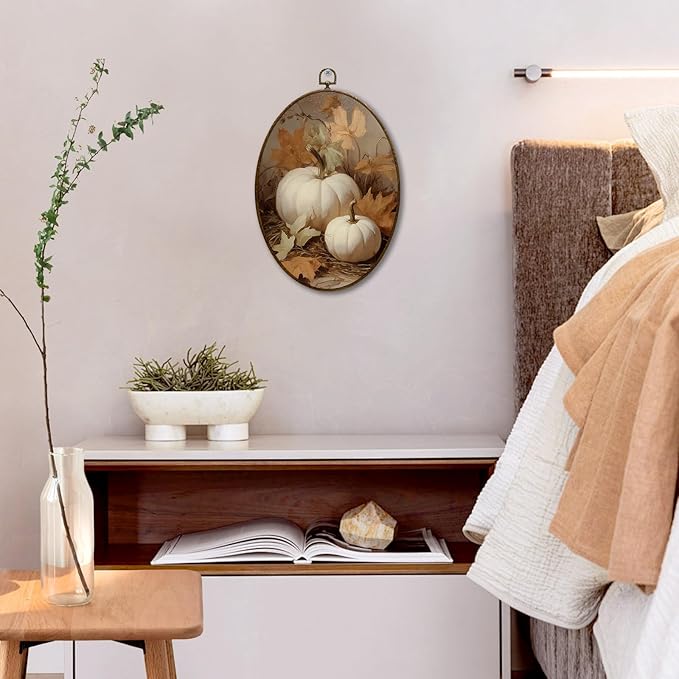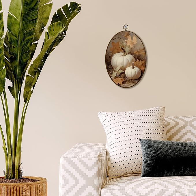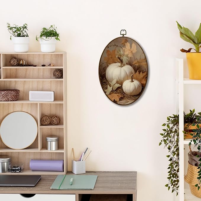 JQF Vintage Fall Pumpkin Oval Wall Art, Farmhouse Autumn Pumpkin Maple Leaf Oval Canvas Wall Art, Retro Rustic Fall Framed Prints Hanging Decor for Home Bedroom Living Room, 8.5x11.5 Inch