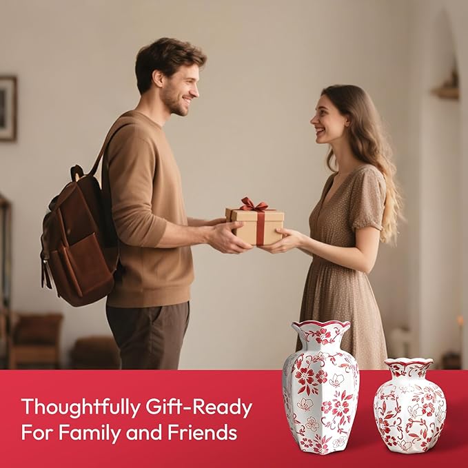Chinoiserie Vase,Red and White Vase,Vintage Ceramic Vases,Flower Vase for Centerpiece,Chinese Cute Vases for Living Room, Office,Home Decor (Red White, Small)