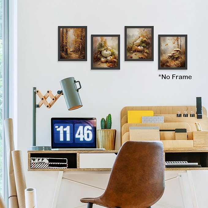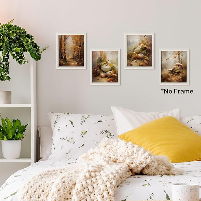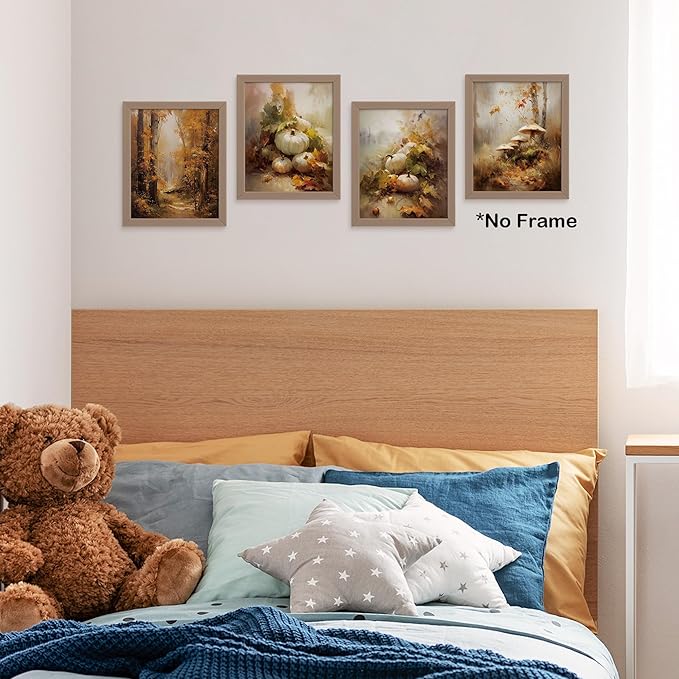 TLESKE Fall Vintage Forest Landscape Posters Prints Unframed 8x10 Set of 4, Autumn Pumpkins Mushroom Wall Art Prints Decor for Farmhouse Bedroom Living Room, Cottagecore Rustic Wall Pictures