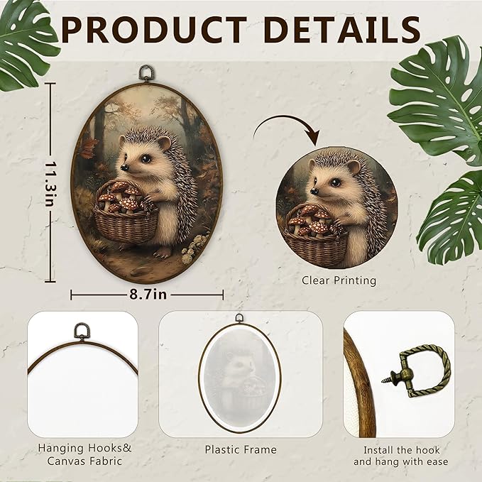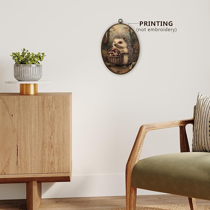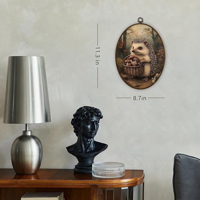 Gnmduw Vintage Hedgehog Oval Wall Art Framed, Fall Cottagecore Mushroom Canvas Prints Hanging Decor, Dark Academia Mushroom Hedgehog Wall Decor for Nursery Gallery Bedroom Living Room, 8.7x11.3 In