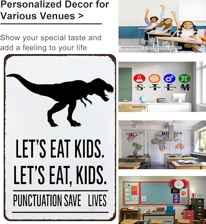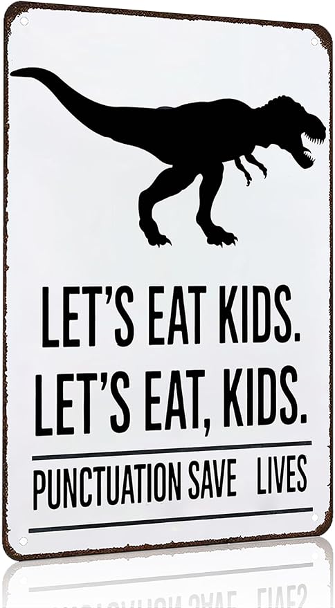 - ๐ฏ GRAMMAR GAG WITH A PURPOSE: "LET'S EAT KIDS" vs. "LET'S EAT, KIDS"! This witty tin sign hilariously proves how punctuation changes meaningโmaking it a perfect English class conversation starter!