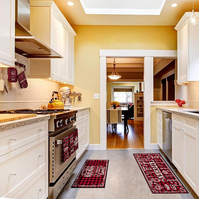 - Intimate Christmas Kitchen Set: the set includes 4 red and black Christmas kitchen towels, 2 red Christmas kitchen rugs, 2 pot holders, and 2 oven mitts; This extensive package ensures you have everything compiled to facilitate your daily kitchen tasks