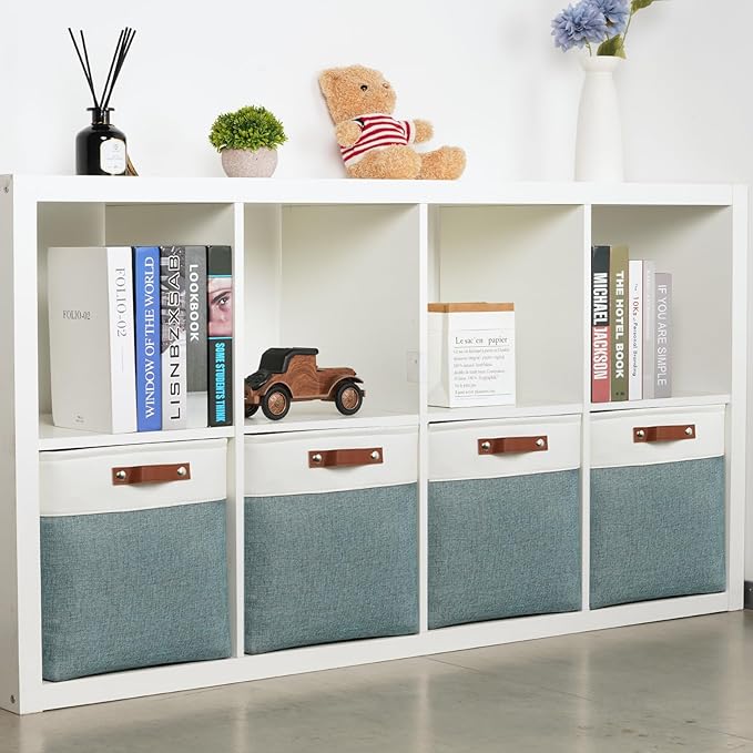 DULLEMELO Storage Bins, 4 Pack Of 13x13x13 Decorative Storage Cube Bins Suit Office, Home, Shelves And Closet, Stackale Gift Baskets Empty with Leather handle (White&Deep Green)