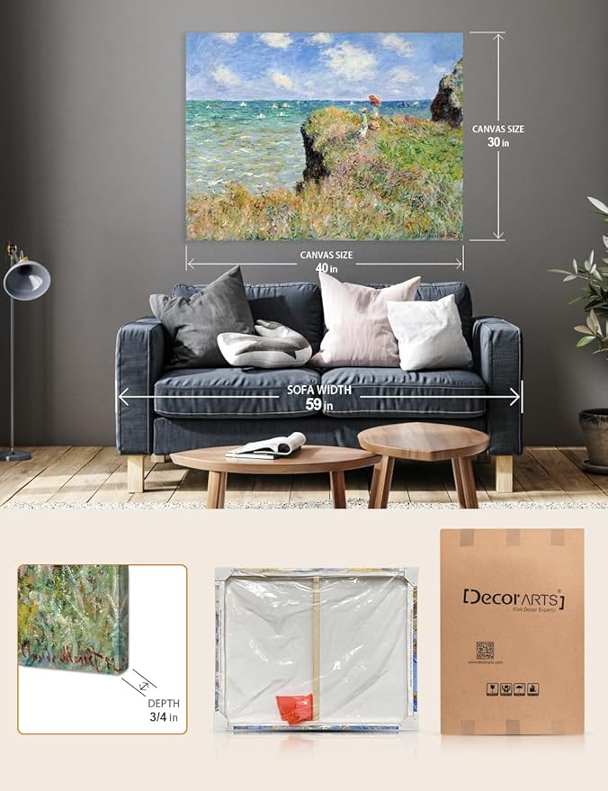 DECORARTS - The Cliff Walk at Pourville by Claude Monet, Museum-Quality Giclee Canvas Print, Wall Art Reproduction, 40" W x 30" H, Made in USA