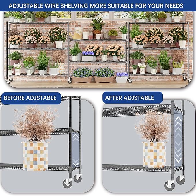 - 【Heavy Duty Shelving with 2500LBS Load Limit】Our garage shelving is built with thickened carbon-steel and reinforced metal rods, delivering exceptional strength. Each level holds up to 600 lbs on adjustable feet, with an overall load limit of 2500 lbs (600 lbs on wheels). Perfect for garage storage, warehouses, and commercial applications.