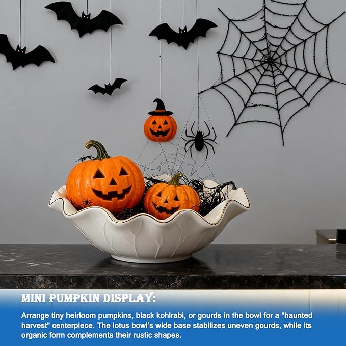 - Ruffled Edge Floral Design: Inspired from the lotus leaf, the delicate and wavy edges create a unique and natural look, making it an ideal centerpiece bowl for kitchen counter décor or as serving dish.Glaze White Finish: The white glaze creates a fresh and inviting look, ideal for any room or occasion