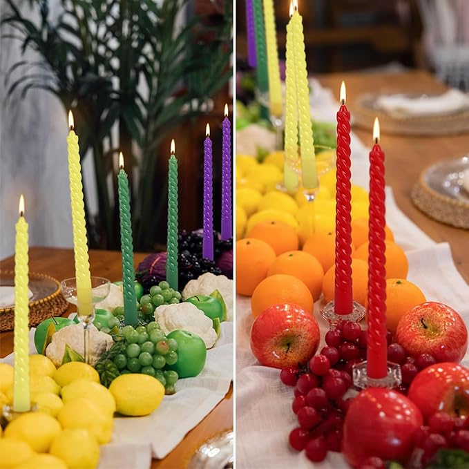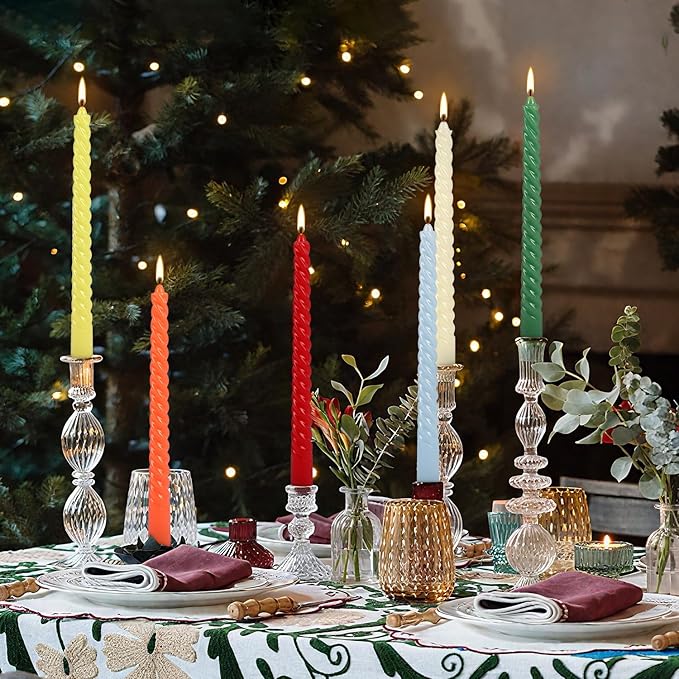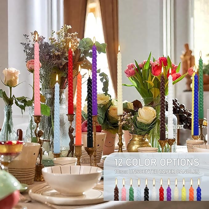 - 1. ๐จ 12 Rich Colors for Stunning Decor This set includes 12 vibrant spiral taper candles, offering a perfect mix of bold and elegant shades. Whether youโre creating a monochromatic centerpiece or a dynamic multi-colored display, these candles effortlessly match weddings, holidays, and home decor themes.