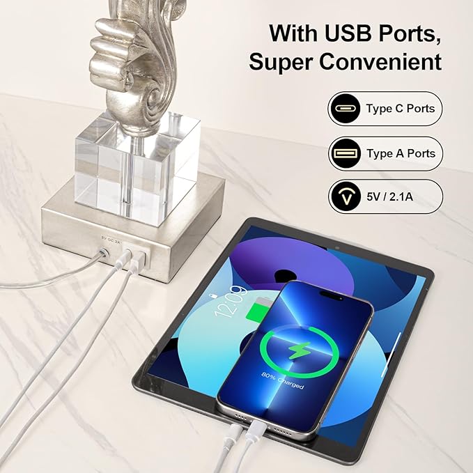 - SUPER CONVENIENT TABLE LAMP WITH USB PORT: Table lamp for bedroom features built-in with a USB-C port & USB-A port, stable maintain 5V 2.1A output, bedside lamp great idea to charge your phone, laptop and other electronic devices when plug in (No matter lights on or off), fully save your time and space. 5ft plenty long enough cord table lamp with USB port, easy reach outlets, really enhances functionality without compromising on aesthetics