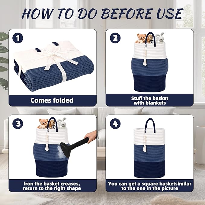 - π[WELL-STRUCTURED & EASY RE-SHAPING]: Heavy duty flexible rope cotton basket was made really strong and it's very durable, tall woven basket can also maintain its shape after use. To recover to it's original shape, fold-able basket is better to fill with some items, like blankets and then steam it with an iron.