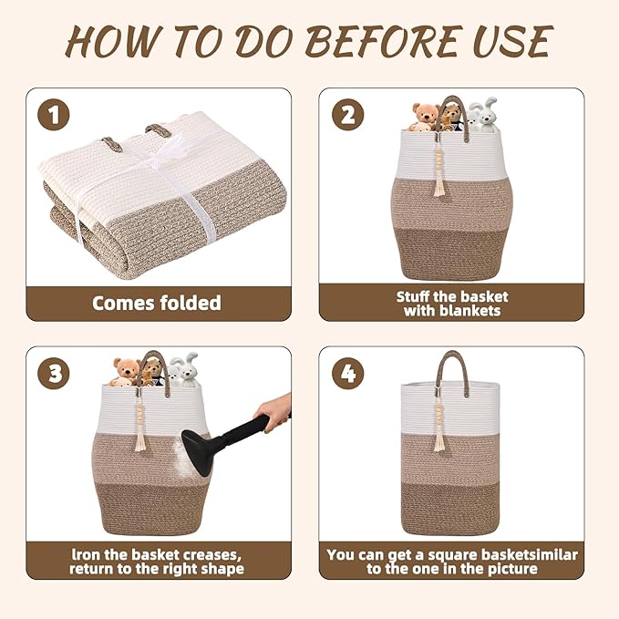 - π[WELL-STRUCTURED & EASY RE-SHAPING]: Heavy duty flexible rope cotton basket was made really strong and it's very durable, tall woven basket can also maintain its shape after use. To recover to it's original shape, fold-able basket is better to fill with some items, like blankets and then steam it with an iron.