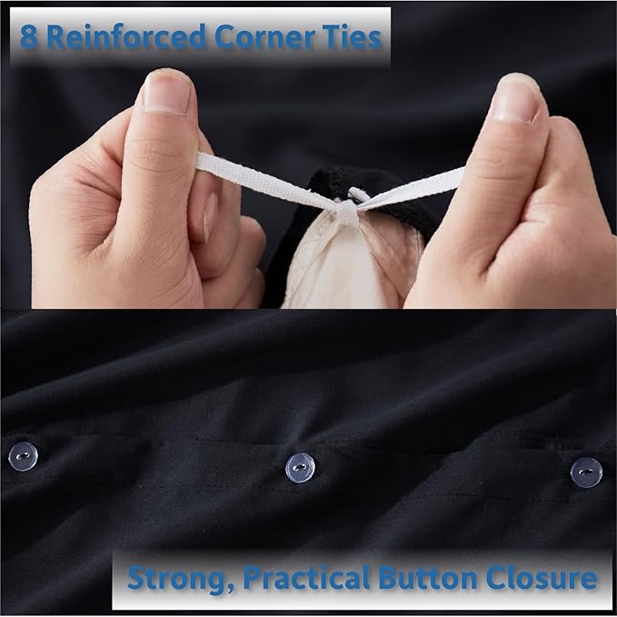 - Hotel Duvet Cover: Our microfiber duvet cover includes 8 inner ties to keep the included comforter securely in place, along with a practical clear button closure for a seamless look. Pillow sham features a stylish 2” flange and back overlap closure.