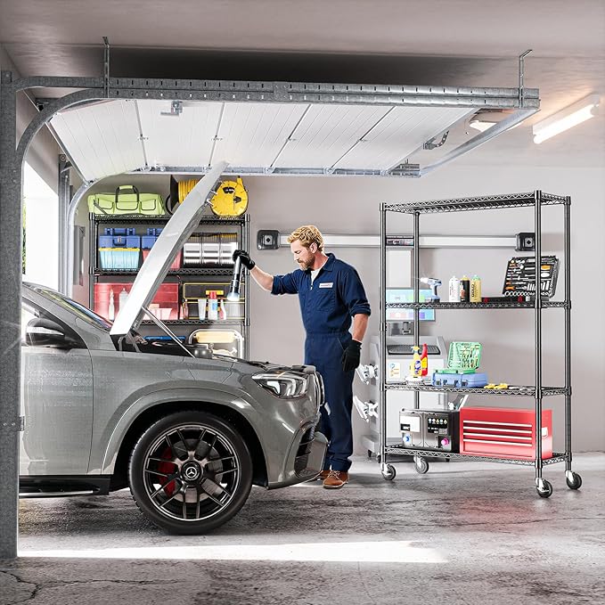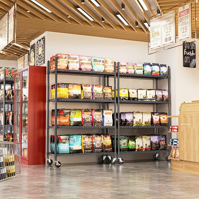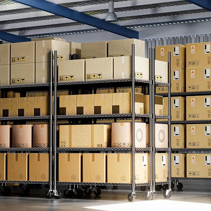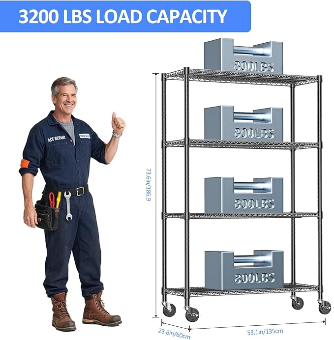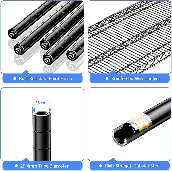 - COMMERCIAL-GRADE HEAVY DUTY – Built with premium carbon steel and 25.4mm thick metal rods, each shelf supports up to 660 lbs on leveling feet, with a total capacity of 2200 lbs (approx. 530 lbs on wheels). Perfect for heavy-duty storage needs.