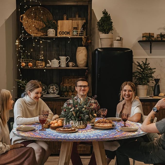 Fitted Round Tablecloth Bohemian Vinyl Patio Table Cloths for 36-44" Tables Camper Travel Vacation Accessories Living Room New HomeHouse Decorations Outdoor Road Trip Must Haves
