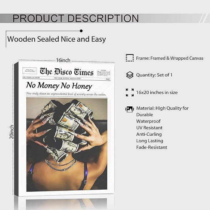 No Money No Honey Wall Art Paintings Hot Girl Love Money Newspaper Wall Decor Funky Preppy Motivational Wall Decor Picture for Home Decor Office Living Room Bathroom Aesthetic Artwork Decoration