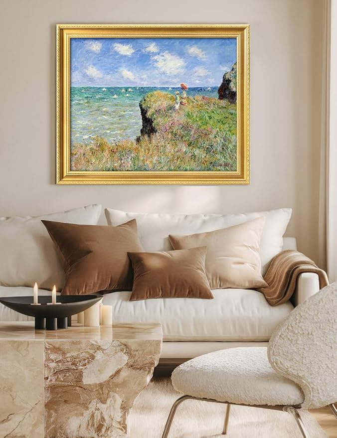 DECORARTS - Claude Monet The Cliff Walk At Pourville Giclee Print with Gold Solid Wood Frame, Impressionist Large Framed Wall Art, Ready to Hang, Framed Size 34.75x28.75, Made in USA