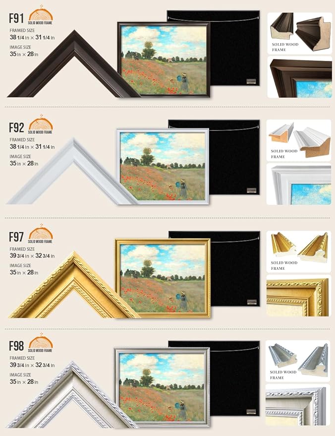 - Oversized Custom Framed Art - 35x28" Monet canvas in extra-large format. Customize your solid wood frame through Customize Now. Outer size increases about 3.25-4.75" with frame. Velvet-like backing, ready to hang with gloves, level, screws included.