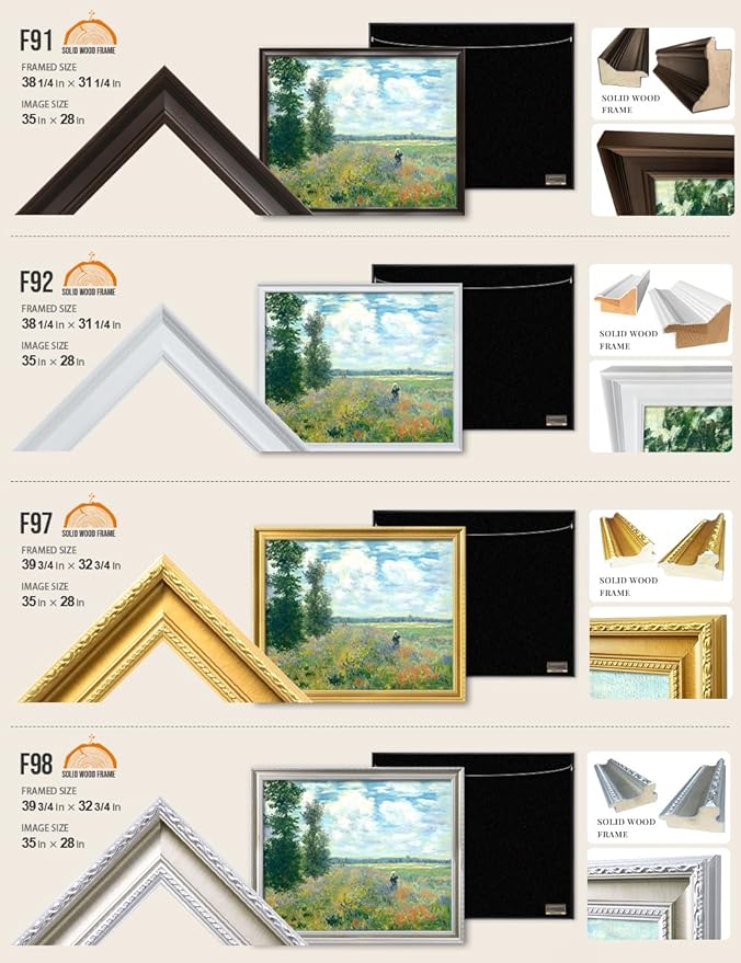 - Oversized Custom Framed Art - 35x28" Monet canvas in extra-large format. Customize your solid wood frame through Customize Now. Outer size increases about 3.25-4.75" with frame. Velvet-like backing, ready to hang with gloves, level, screws included.