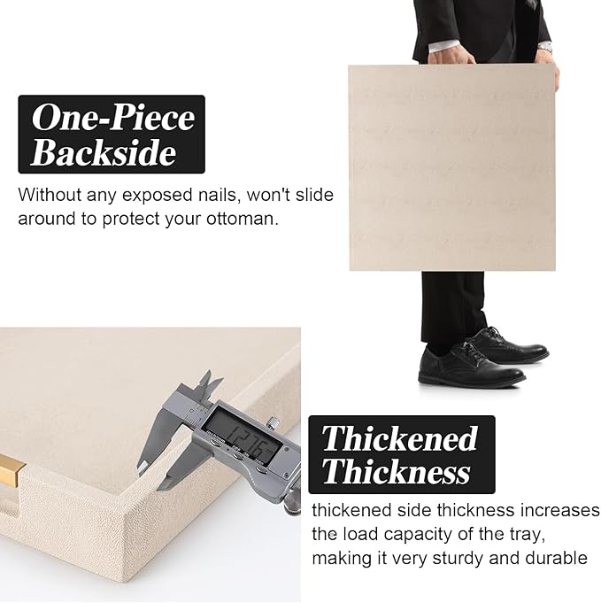 - Durable Leather Tray: Our trays are exquisitely crafted with high-end gold handles,The structure is made of 12mm thick medium density fiberboard, which is very sturdy and lightweight. The surface is made of gorgeous shagreen leather, rich in rich textures, which looks very gorgeous and soft and smooth, and will not hook onto the surface of your footstool or other furniture.